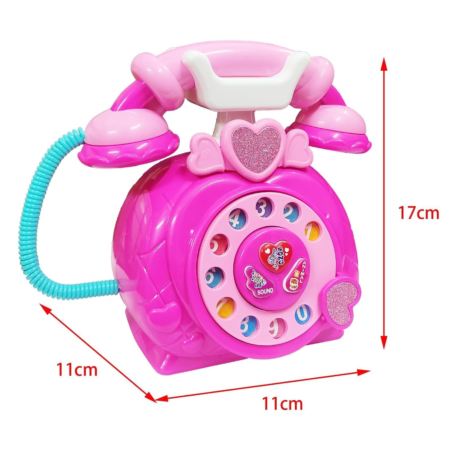 - It has a simulating receiver attached to a silicon spring with rotating retro classic style numbered dial wheel with different ringing sound effects.