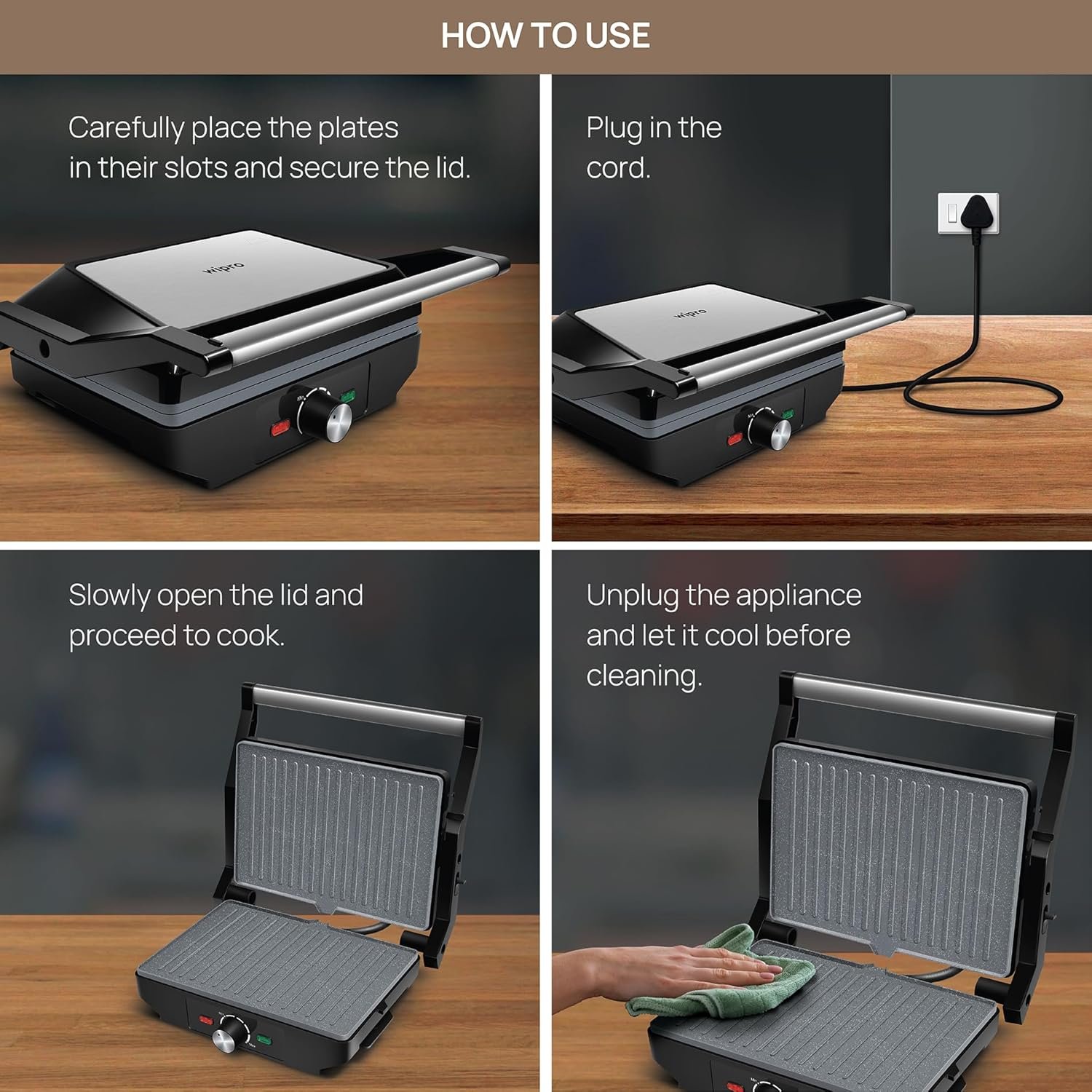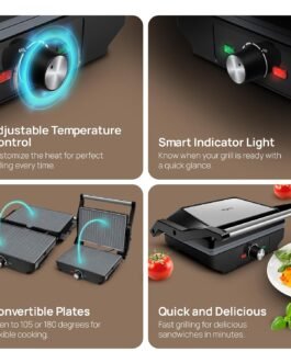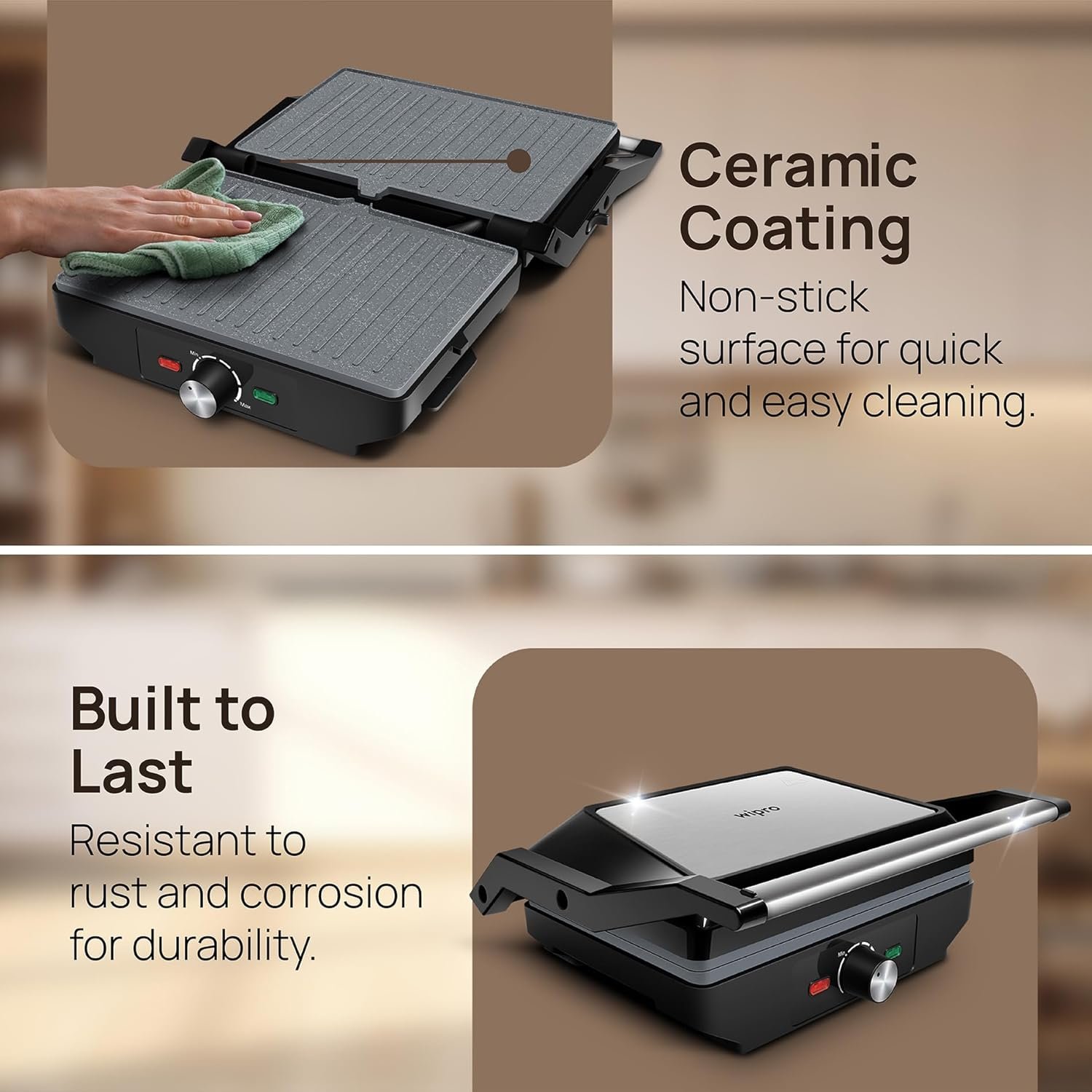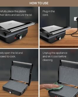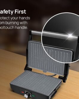 Sandwich Maker – Big size Non Toxic Ceramic plates (230mm*145 mm) opens upto 105ᶿ (Extra 15ᶿ) for easy operation and usage