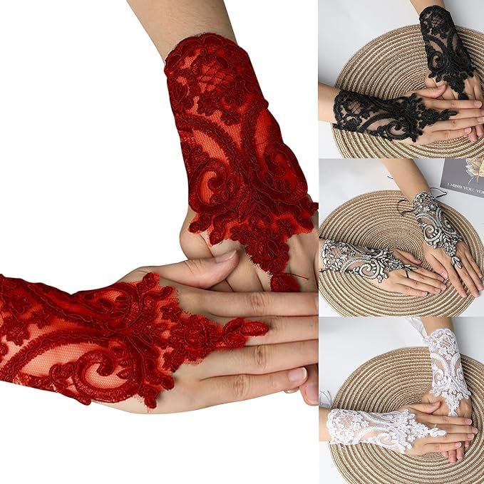 Add a touch of vintage elegance to your ensemble with these exquisite fingerless lace gloves. Available in classic black, passionate red, pure white, and sophisticated gold black, these gloves feature intricate floral and scroll patterns that create a stunning gothic or Victorian aesthetic. The delicate lace overlay extends gracefully from the wrist to the fingers, offering a perfect blend of sophistication and allure. These versatile accessories are ideal for formal occasions, weddings, costume parties, or theatrical performances. The fingerless design allows for practical use while maintaining a glamorous appearance. The detailed embroidery work showcases beautiful baroque-inspired motifs, making each pair a statement piece. These one-size-fits-most gloves are crafted with attention to detail, ensuring both comfort and style. Perfect for brides seeking a traditional yet dramatic accent, or for anyone wanting to add a romantic, vintage-inspired element to their wardrobe.