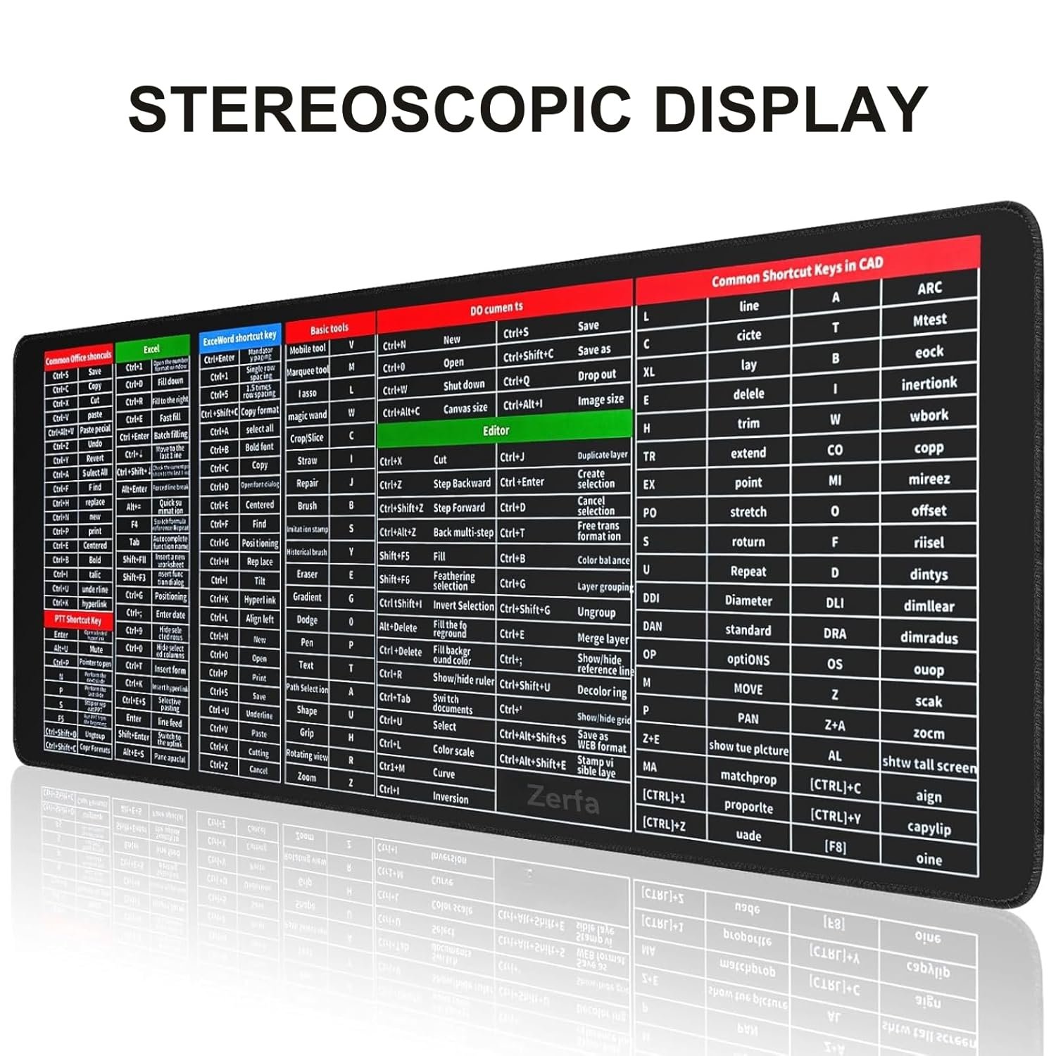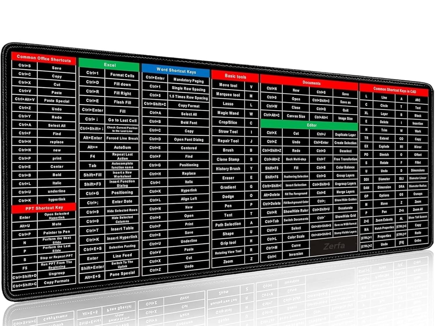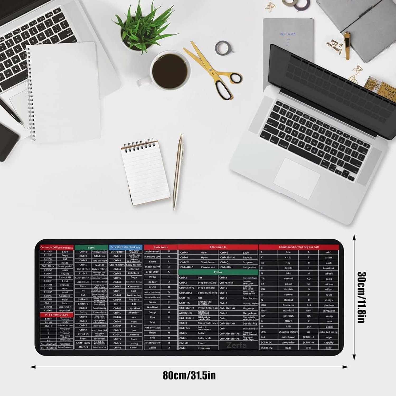 Zerfa Extra Large (800x300x2mm) Extended Gaming Laptop Mouse Pad, Thick Non-Slip Rubber Base Desk Mat Keyboard pad for PC/Computer (Office Software English Shortcut Key Design) Black