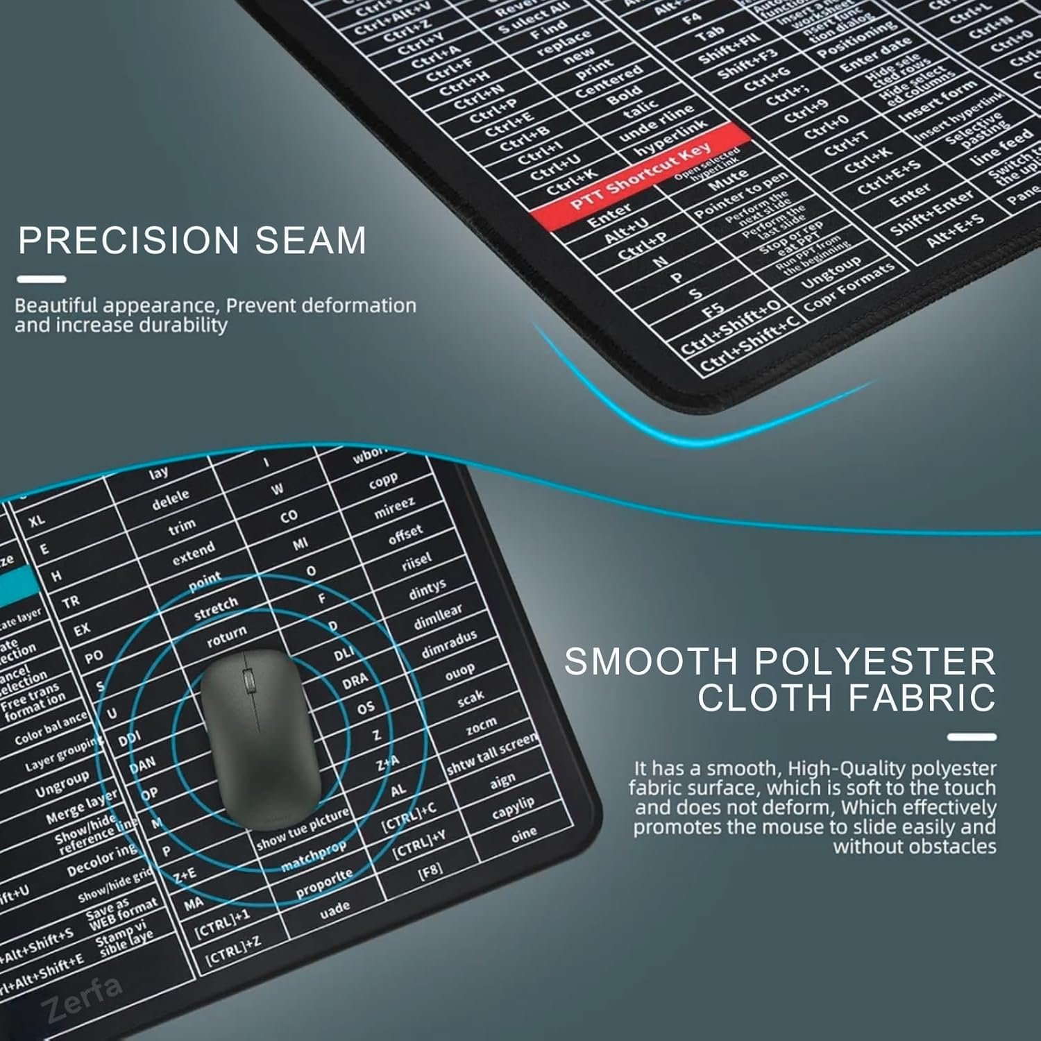 Shortcut key mouse pad:The frontal patterns are all shortcuts about(word/excel/power point ), which can provide convenience for our daily work.The keyboard and mouse can be placed on the mouse pad to minimize friction with the table and protect your table.